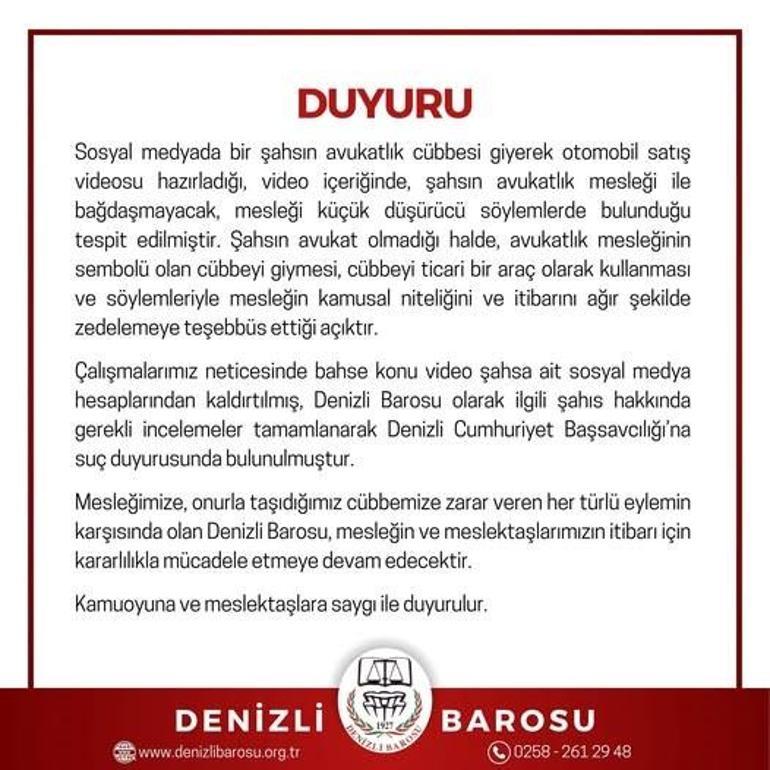 "Sosyal medyada bir şahsın avukatlık cübbesi giyerek otomobil satış videosu hazırladığı, video içeriğinde, şahsın avukatlık mesleği ile bağdaşmayacak, mesleği küçük düşürücü söylemlerde bulunduğu tespit edilmiştir. Şahsın avukat olmadığı halde, avukatlık mesleğinin sembolü olan cübbeyi giymesi, cübbeyi ticari bir araç olarak kullanması ve söylemleriyle mesleğin kamusal niteliğini ve itibarını ağır şekilde zedelemeye teşebbüs ettiği açıktır. Çalışmalarımız neticesinde bahse konu video şahsa ait sosyal medya hesaplarından kaldırtılmış, Denizli Barosu olarak ilgili şahıs hakkında gerekli incelemeler tamamlanarak Denizli Cumhuriyet Başsavcılığı’na suç duyurusunda bulunulmuştur. Mesleğimize, onurla taşıdığımız cübbemize zarar veren her türlü eylemin karşısında olan Denizli Barosu, mesleğin ve meslektaşlarımızın itibarı için kararlılıkla mücadele etmeye devam edecek"