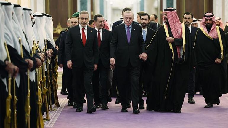 Cumhurbaşkanı Erdoğan ile birlikte eşi Emine Erdoğan, Dışişleri Bakanı Hakan Fidan, Hazine ve Maliye Bakanı Mehmet Şimşek, Aile ve Sosyal Hizmetler Bakanı Mahinur Özdemir Göktaş, Enerji ve Tabii Kaynaklar Bakanı Alparslan Bayraktar, Sanayi ve Teknoloji Bakanı Mehmet Fatih Kacır, Gençlik ve Spor Bakanı Osman Aşkın Bak, Milli Savunma Bakanı Yaşar Güler, Sağlık Bakanı Kemal Memişoğlu, Cumhurbaşkanlığı İletişim Başkanı Burhanettin Duran, Cumhurbaşkanı Dış Politika ve Güvenlik Başdanışmanı Akif Çağatay Kılıç ile bazı yetkililer de Suudi Arabistan'a geldi.